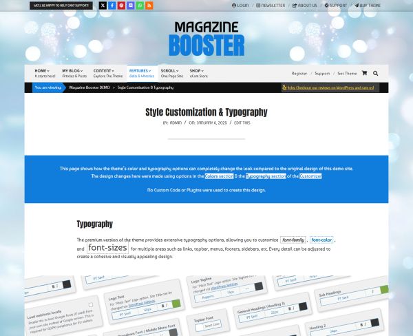 The premium version of the theme provides extensive typography options, allowing you to customize font-family, font-color, and font-sizes for multiple areas such as links, topbar, menus, footers, sidebars, etc. Every detail can be adjusted to create a cohesive and visually appealing design.